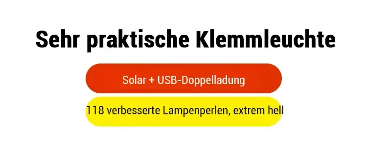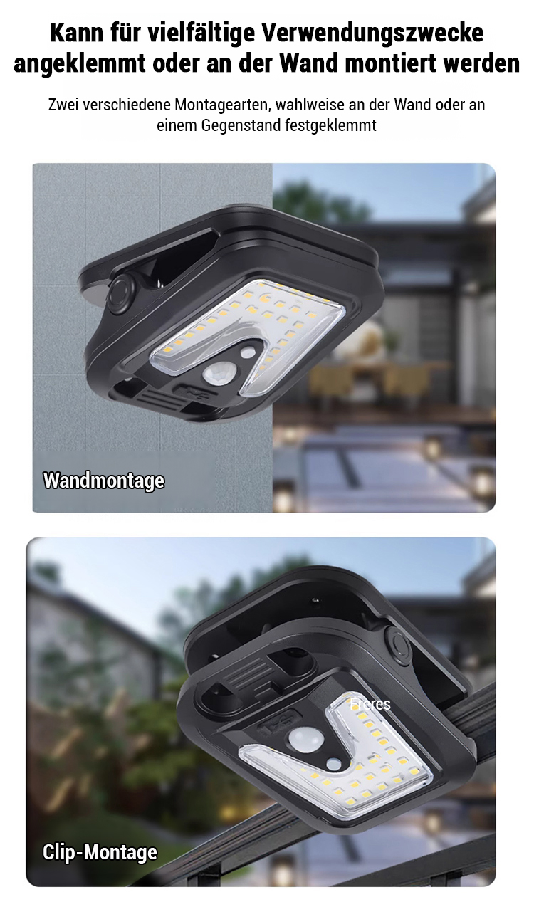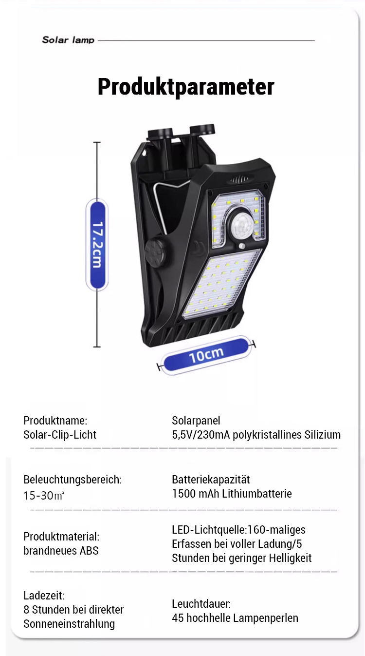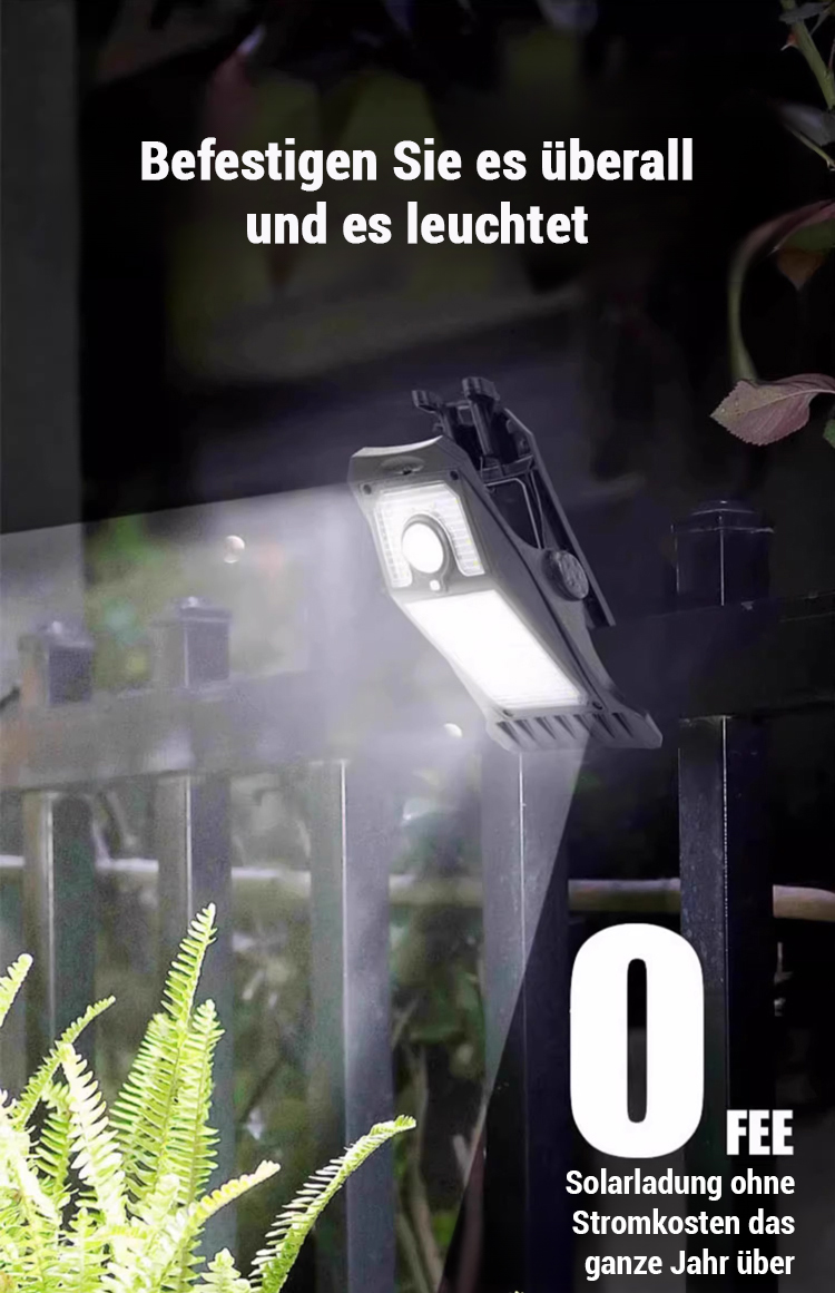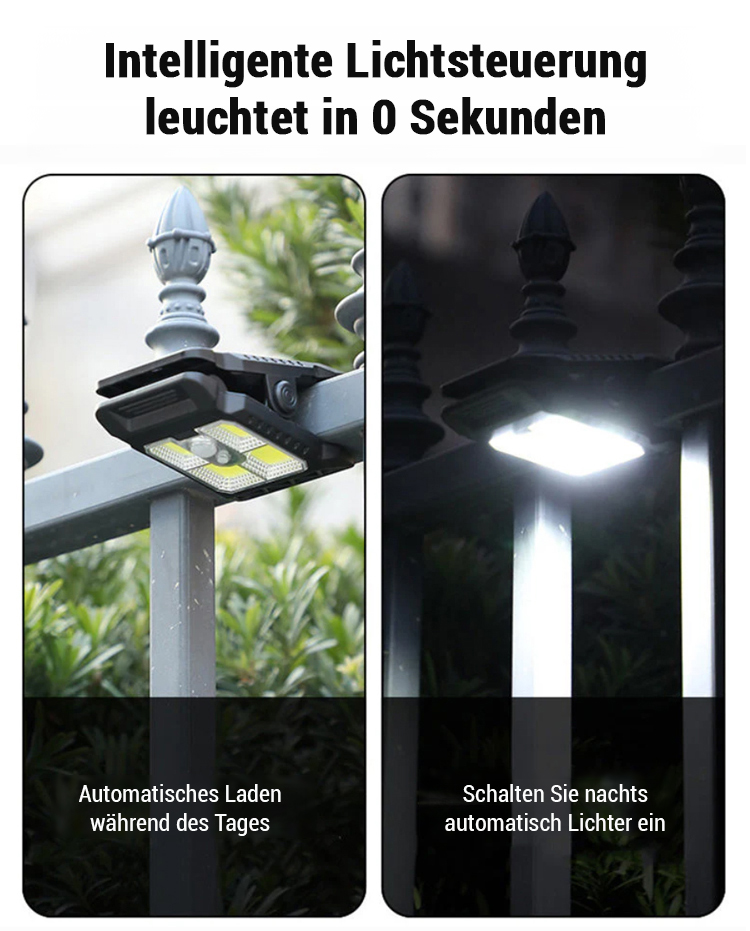 365 Tage - 0 € Stromkosten! Intelligente Sensor-Solar-Klemmleuchte