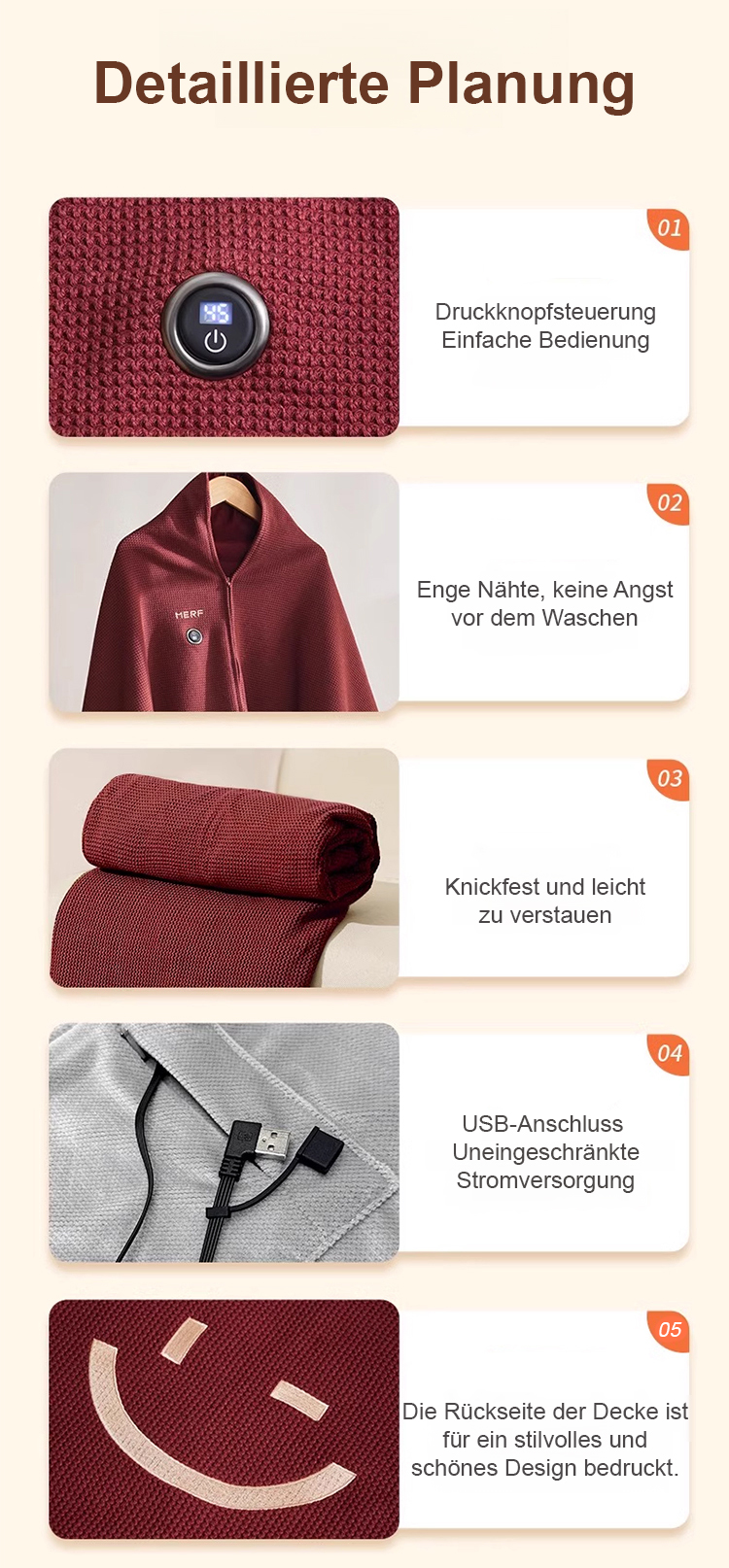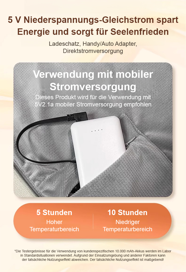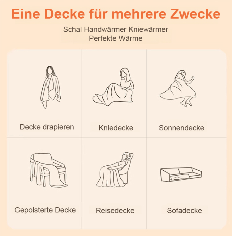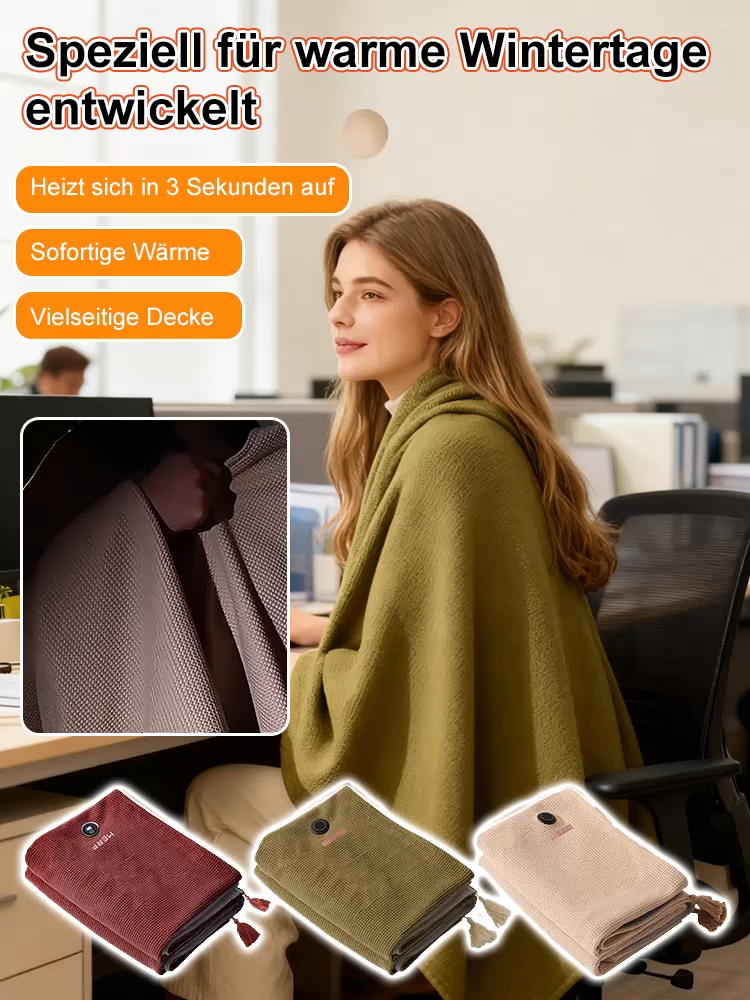 Drei bequeme Temperaturstufen zur Auswahl: ✅️35 °C: Perfekt als wärmender Schulterumhang zu Hause oder im Büro. ✅️45 °C: Ideal als Mittagsschlafdecke – so wachst du nicht mehr fröstelnd auf. ✅️55 °C: Speziell für ältere Eltern entwickelt, um Schultern und Knie gezielt und wohltuend zu wärmen.